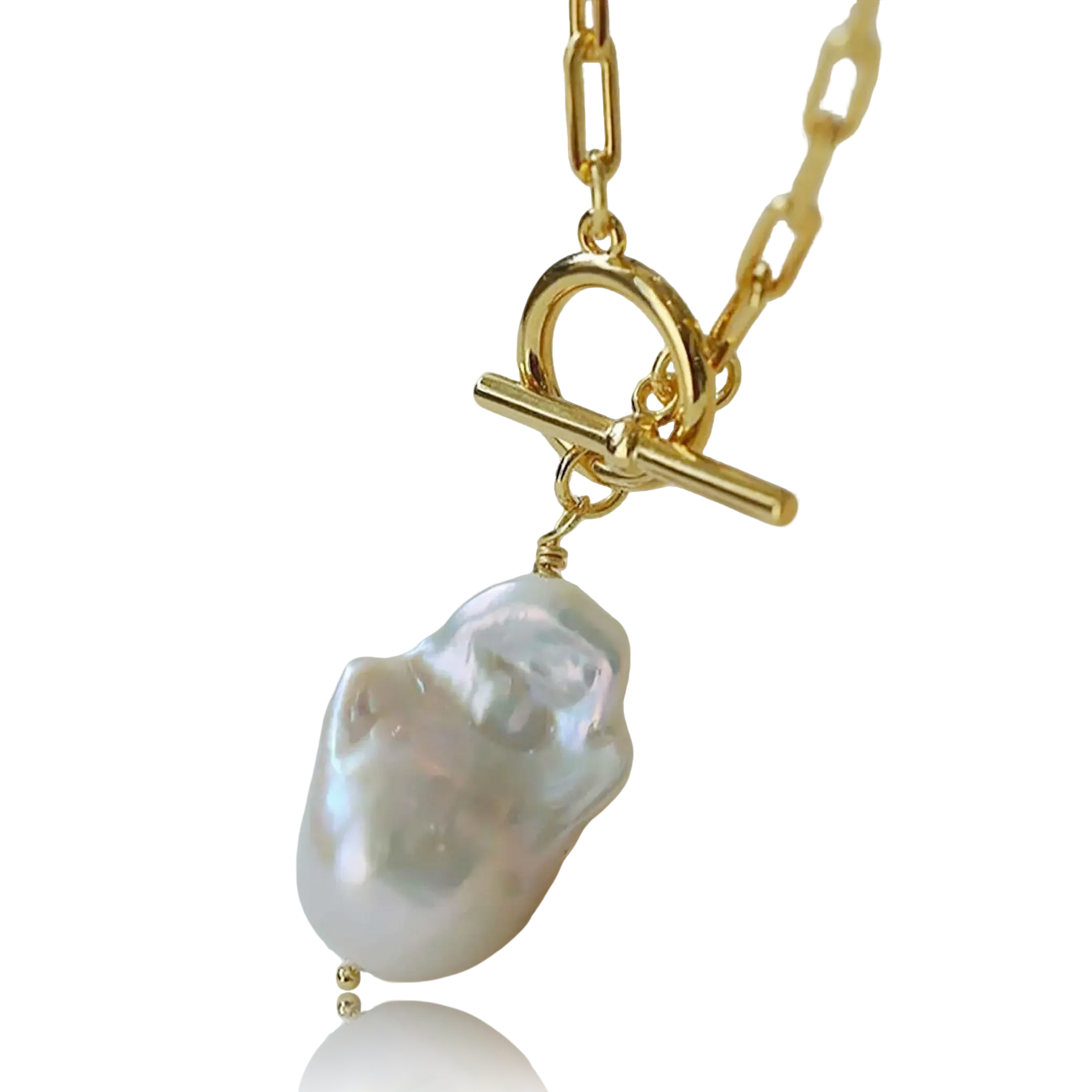 This stunning necklace features a delicate combination of baroque pearls and a bold gold chain, creating a perfect blend of classic elegance and modern design. The two-layer design highlights a radiant baroque pearl pendant, suspended from a sleek gold toggle clasp. The juxtaposition of soft pearls and structured chain links captures the essence of morning light, offering a sophisticated and versatile accessory. Ideal for both casual and formal occasions, this necklace adds a refined touch to any look.