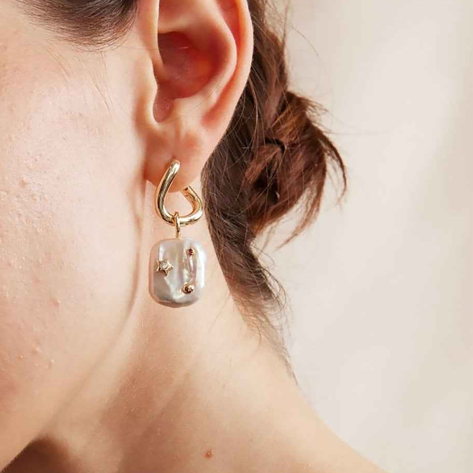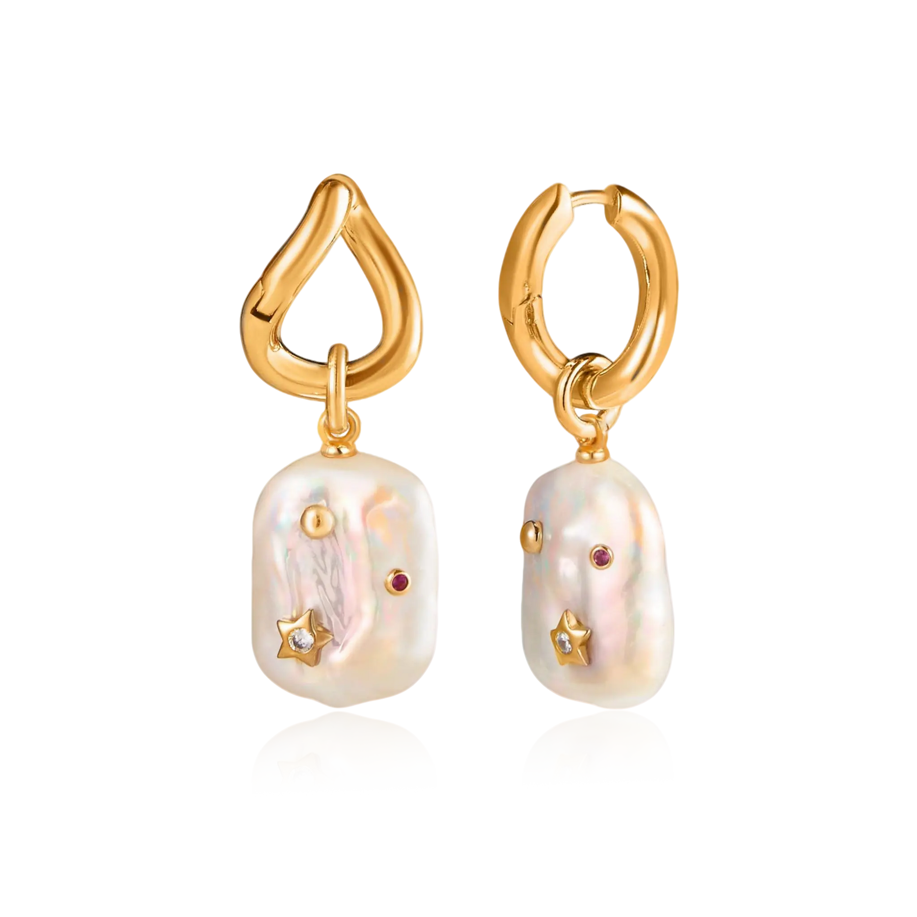 These earrings are crafted with natural baroque pearls, each shaped organically and finished with delicate celestial details. Set against the soft iridescence of the pearl surface, tiny star accents and subtle gemstone touches evoke a quiet night sky, where no two moments are ever the same. The sculptural gold-toned hoops add a modern edge, balancing elegance with individuality. Designed to celebrate asymmetry and imagination, this piece transforms the poetry of moonlight and stars into a refined yet expressive statement.
