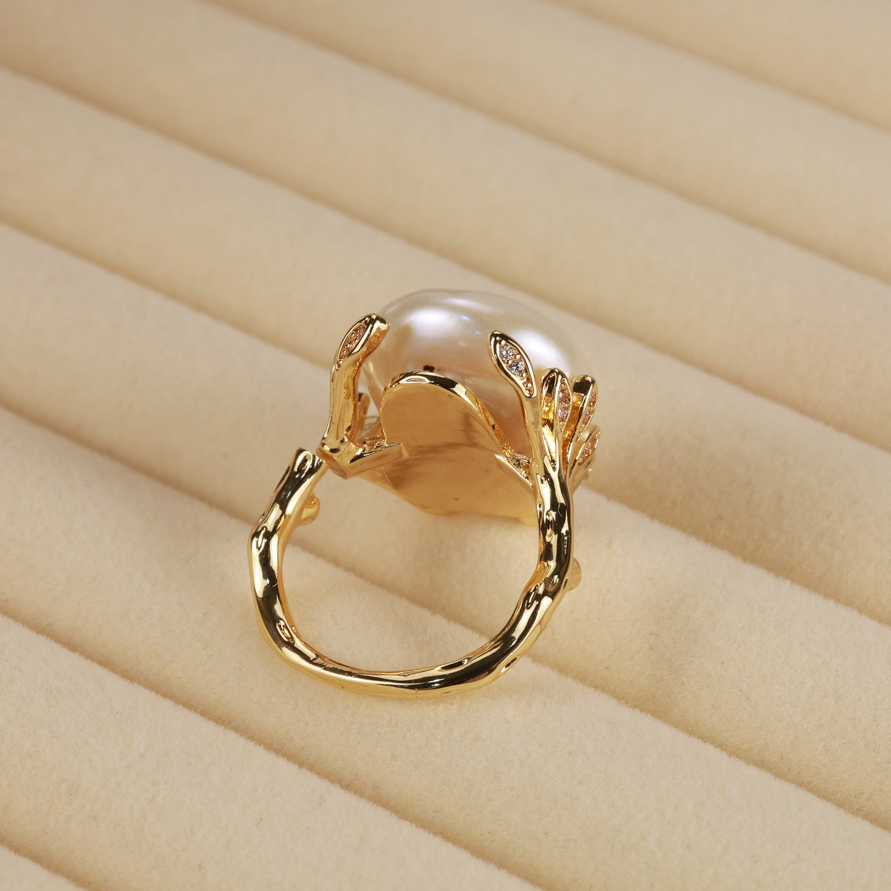 This elegant ring features a luminous pearl elevated within a sculptural gold-toned setting that gently frames the stone like a crown. Subtle crystal accents along the band enhance the soft glow of the pearl while adding delicate sparkle. The open, architectural design creates a refined balance between modern structure and timeless elegance, making it a graceful statement piece for both everyday sophistication and special occasions.