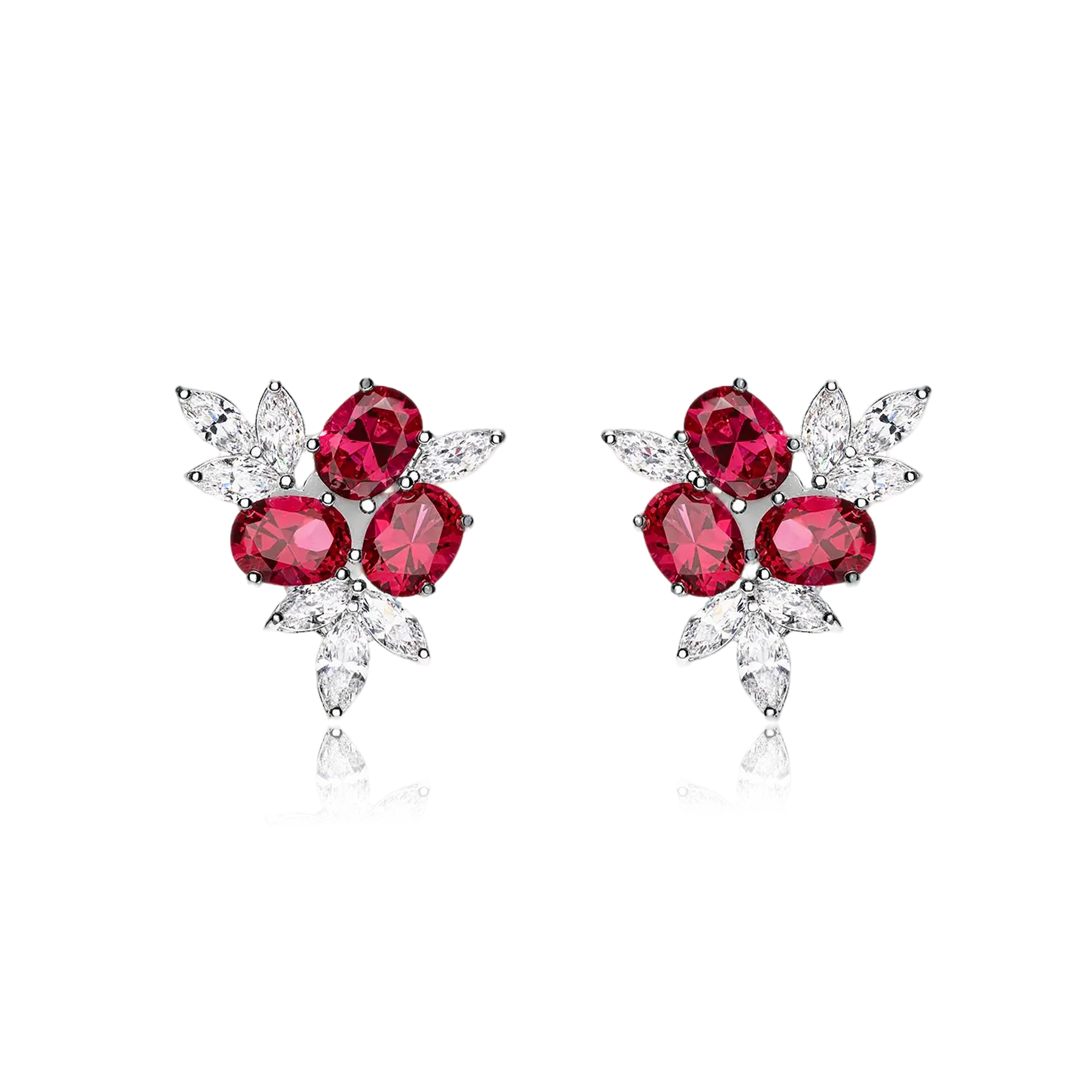 Crafted in polished silver, these earrings feature richly colored red gemstones arranged in a floral-inspired silhouette, accented with clear stones that mimic delicate petals. The balanced composition creates depth and brilliance, allowing each gemstone to catch the light with refined intensity. Elegant yet expressive, they bring a romantic statement to evening wear while remaining sophisticated enough for special daytime occasions.