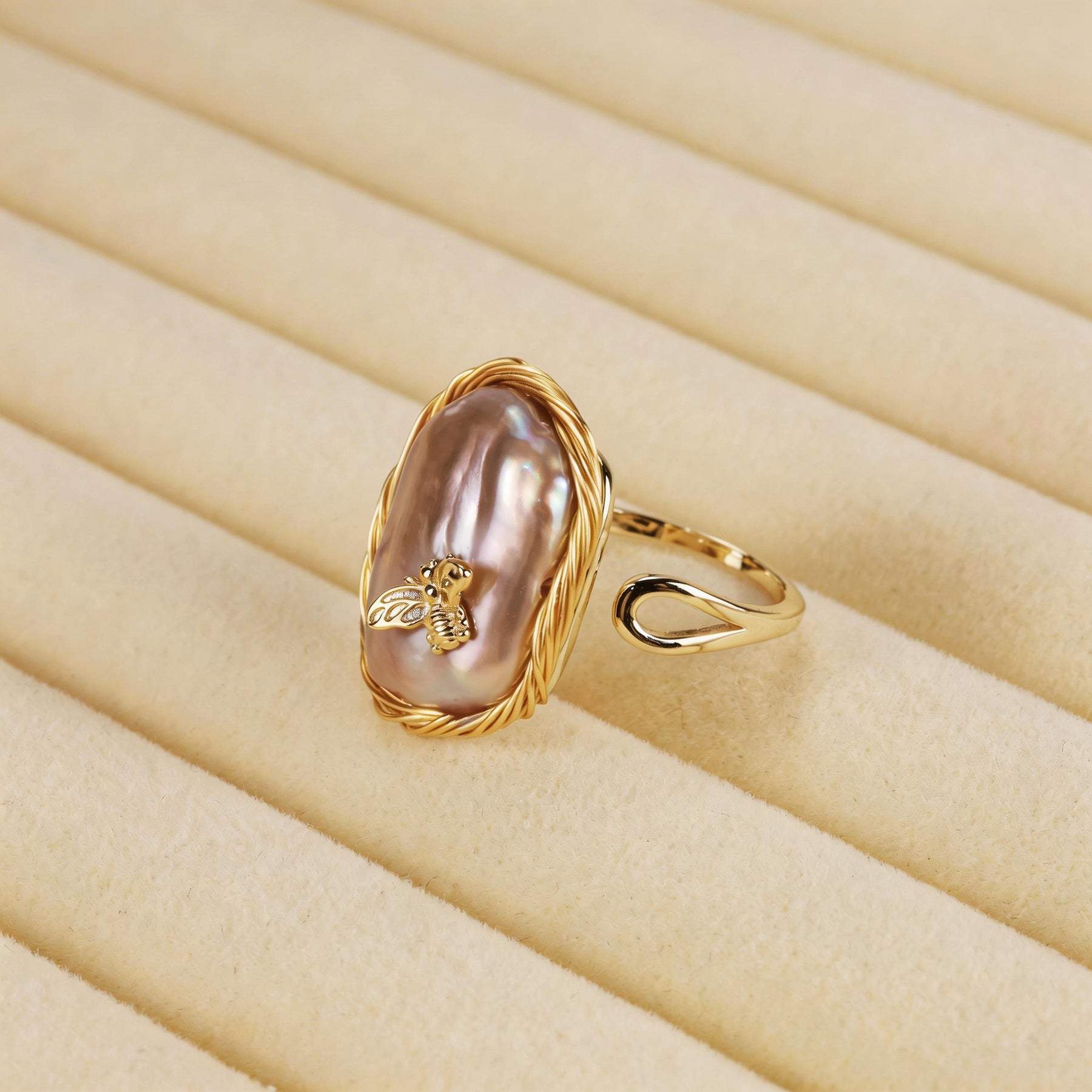 This distinctive ring features a large baroque pearl set within a textured gold-toned frame, crowned with a delicate bee detail that adds a whimsical touch. The organic shape of the pearl reflects soft iridescent tones, while the sculptural open band creates a modern, artistic silhouette. Inspired by nature and craftsmanship, this statement piece blends elegance with playful charm, making it a unique accent for both everyday styling and special occasions.