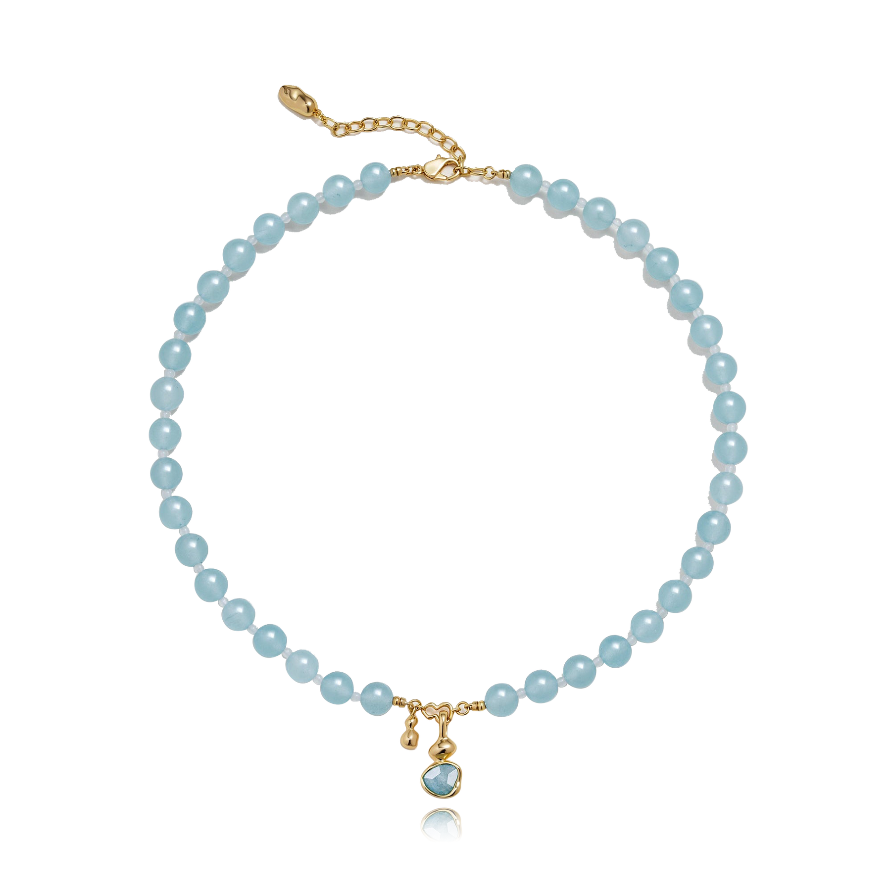This necklace is crafted with smooth, translucent blue beads that evoke the calm and clarity of ocean light. The gentle rhythm of the beaded strand is accented by a delicate gold-toned charm, adding a refined focal point without disrupting the softness of the design. Light and effortless on the neck, it brings a sense of freshness, balance, and quiet elegance to everyday wear or layered combinations.