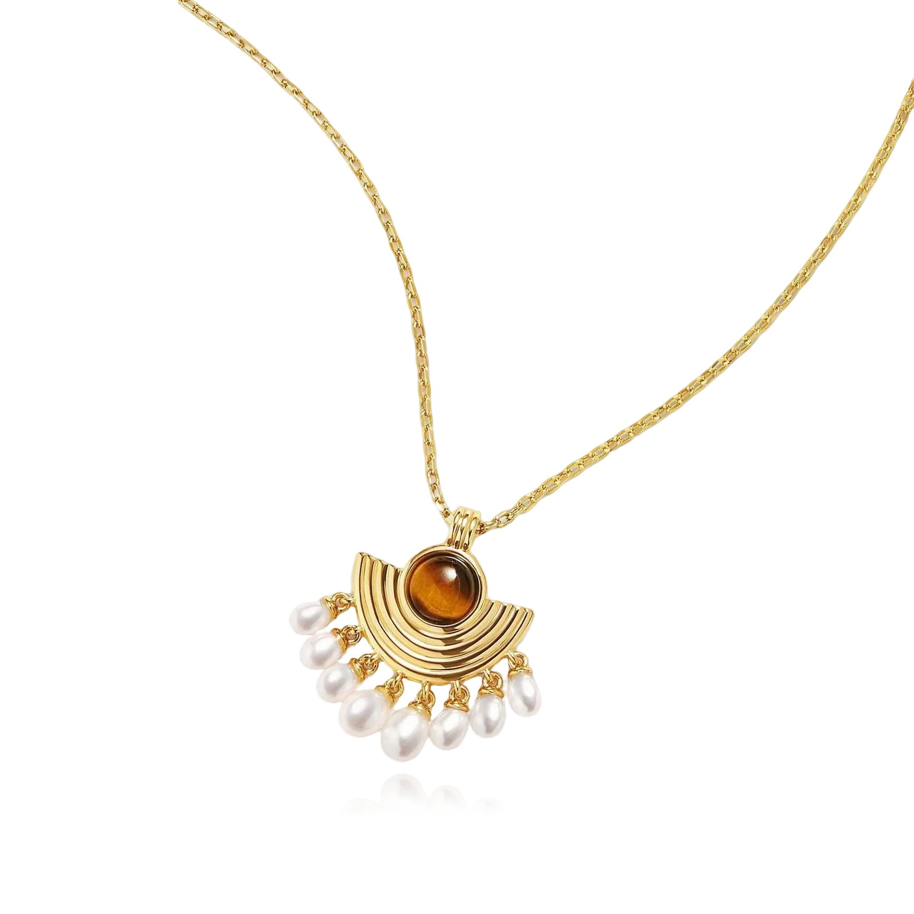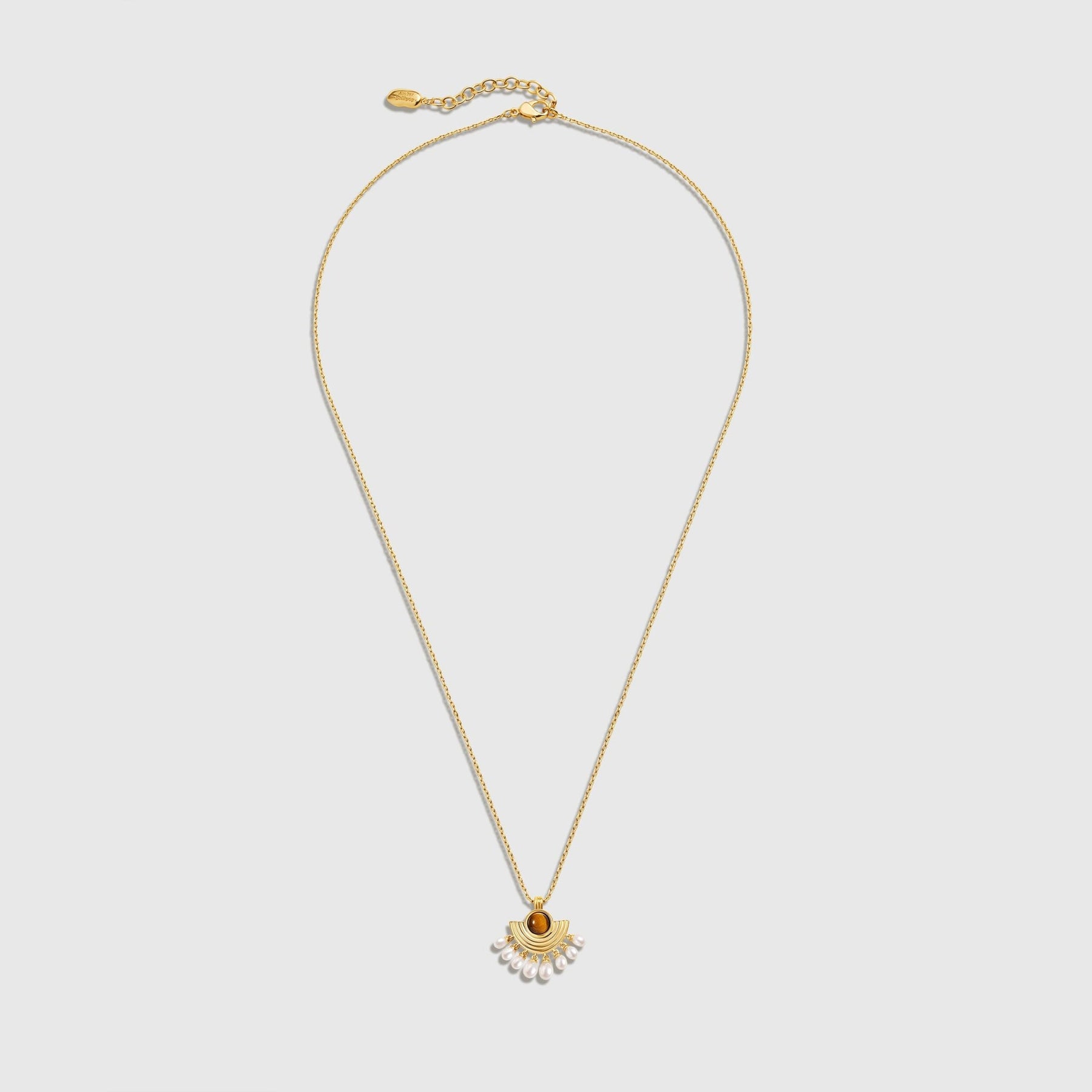 The Opera Phantom Tiger's Eye Pearl Necklace is a captivating blend of bold sophistication and delicate charm. Featuring a central tiger's eye stone surrounded by golden arcs, this necklace evokes a vintage-inspired aesthetic, perfectly complemented by the lustrous, dangling pearls. The bold geometric design pairs beautifully with the timeless elegance of pearls, making it an ideal statement piece for both day and evening wear. Whether you're attending a special event or adding flair to a casual look, this necklace adds an aura of mystery and refinement.