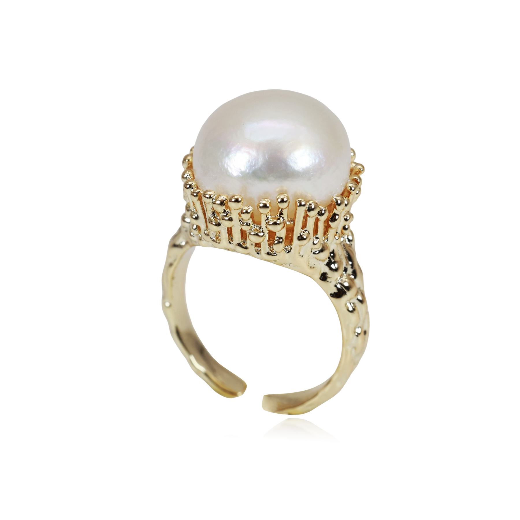 This design centers on a single, high-domed pearl elevated within a textured crown setting. The base structure features vertical bead-like prongs arranged in a tight circular formation, creating a structured yet decorative frame around the pearl. The gold-tone band is slightly irregular with a hand-finished texture, reinforcing a crafted, artisanal character. The contrast between the smooth pearl surface and the detailed metalwork produces a clear focal hierarchy, making it a compact yet visually dominant statement piece.